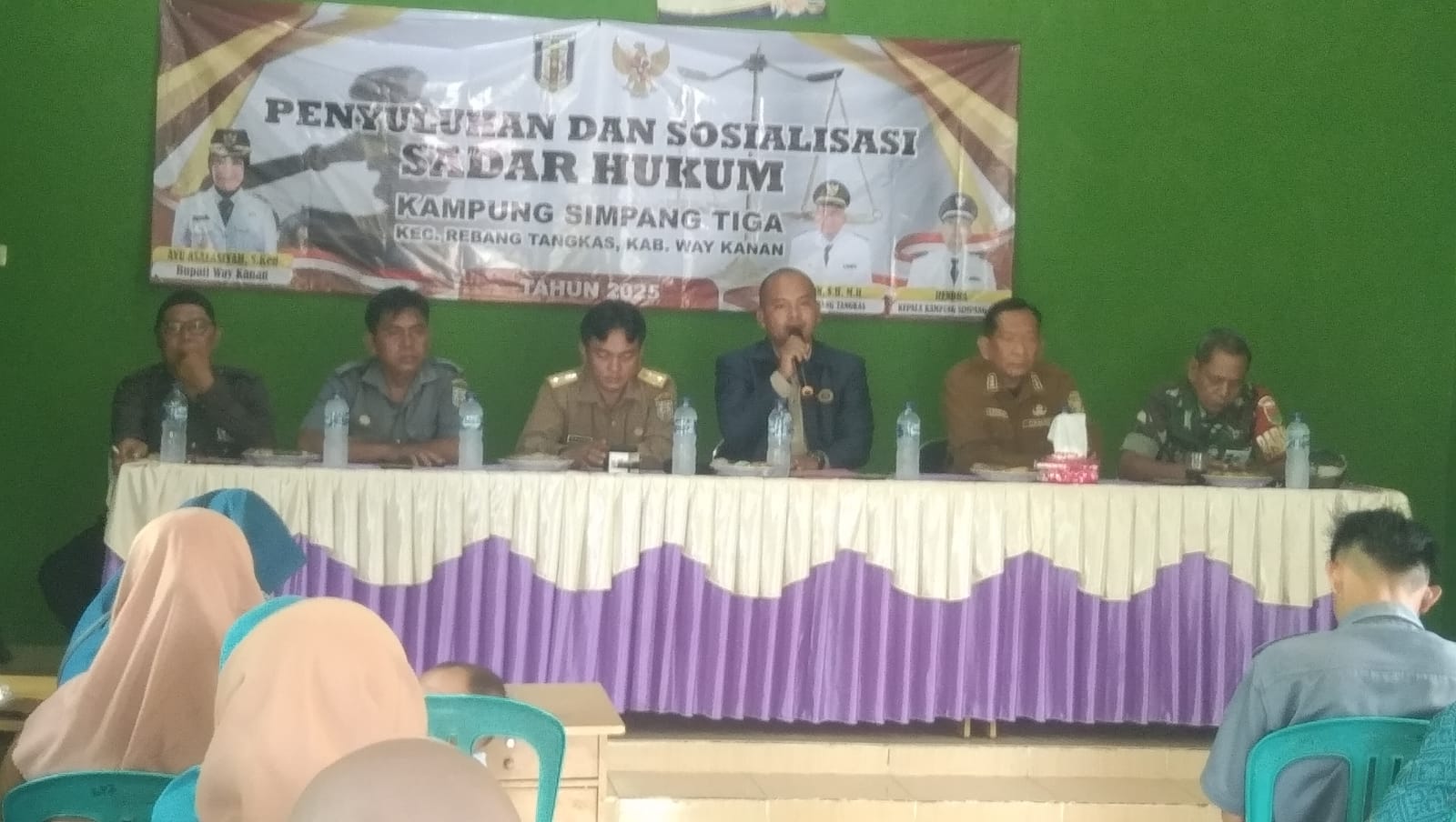 Way Kanan – Pemerintahan Kampung Simpang Tiga, Kecamatan Rebang Tangkas, Kabupaten Way Kanan menggelar kegiatan penyuluhan dan sosialisasi sadar hukum di Balai Kampung Simpang Tiga.