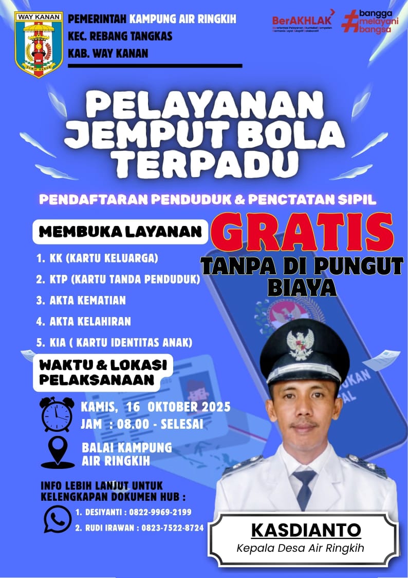 Pemerintah Kampung Air Ringkih, Kecamatan Rebang Tangkas, bersama Dinas Pendaftaran Penduduk dan Pencatatan Sipil (Disdukcapil) Kabupaten Way Kanan menggelar kegiatan pelayanan jemput bola terpadu di Balai Kampung setempat, Kamis (16/10/2025).