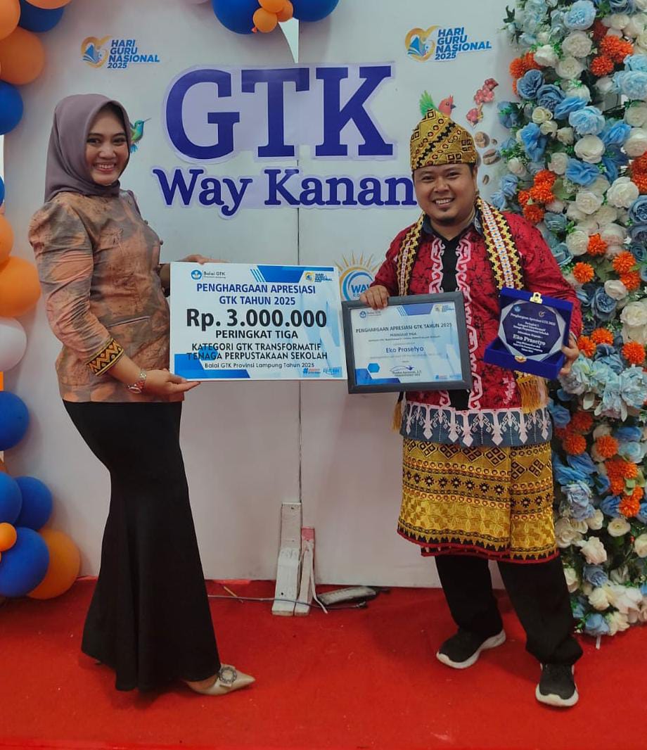 Prestasi membanggakan kembali diraih oleh Eko Prasetyo, tenaga perpustakaan sekolah yang berhasil meraih peringkat ke-3 dalam kategori Tenaga Perpustakaan Sekolah pada ajang Apresiasi GTK Hari Guru Nasional (HGN) 2025 yang diselenggarakan oleh Balai Guru dan Tenaga Kependidikan (Balai GTK) Provinsi Lampung.